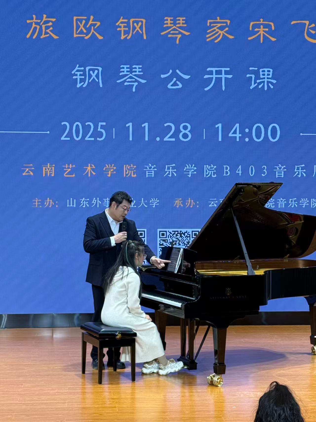 当日晚上,世界杯官方网站入口2026在B403多功能厅举办了指尖星河·滇境琴歌——宋飞钢琴独奏音乐会。旅欧钢琴家、山东外事职业大学国际钢琴艺术中心主任宋飞以“中西对话”为核心理念,通过精湛技艺与深刻洞察,给钢琴系师生演奏了贝多芬《月光》《黎明》奏鸣曲、肖邦两首夜曲以及《黄河钢琴协奏曲》与张朝《皮黄》。音乐会上,宋飞与公司钢琴系刘晖副教授共同演奏《黄河钢琴协奏曲》,为观众带来极致的听觉享受,更在艺术传承、文化融合与精神引领层面彰显出多元价值与深远意义。