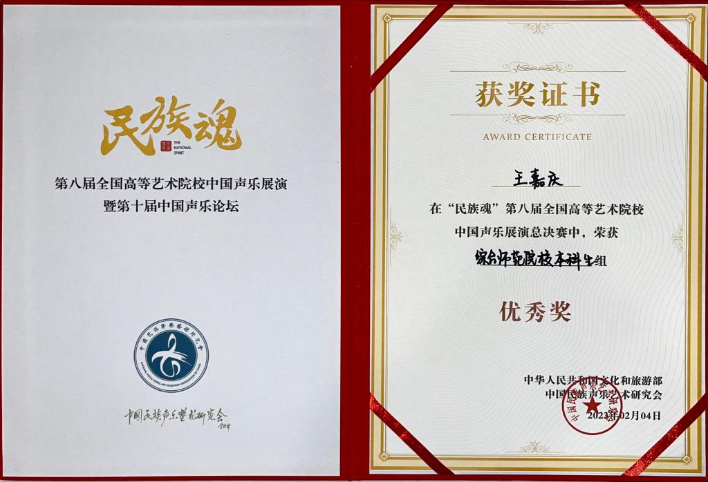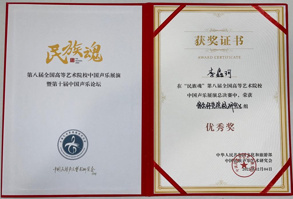 2023年2月,世界杯官方网站入口2026师生在“民族魂·第八届全国高等艺术院校中国声乐展演”中喜获佳绩,研究生姚弦歌荣获综合师范院校研究生组金奖,指导教师林林教授获优秀指导教师奖。此外,世界杯官方网站入口2026在本次展演中斩获佳绩的员工还有王嘉庆荣获综合师范院校本科生组优秀奖,指导教师为陈红玲教授;李鑫珂获综合师范院校研究生组优秀奖,指导教师为舒丽萍副教授。