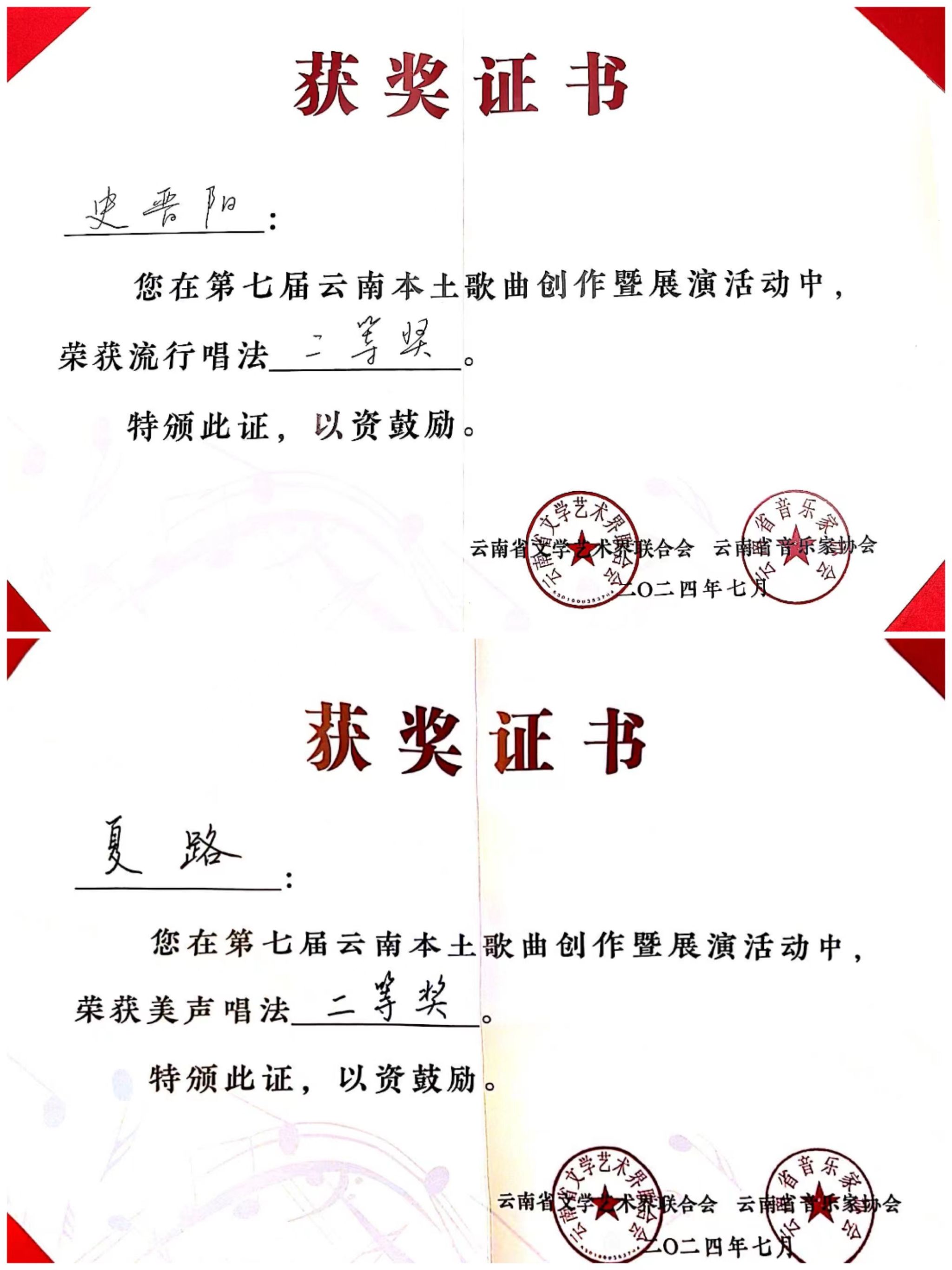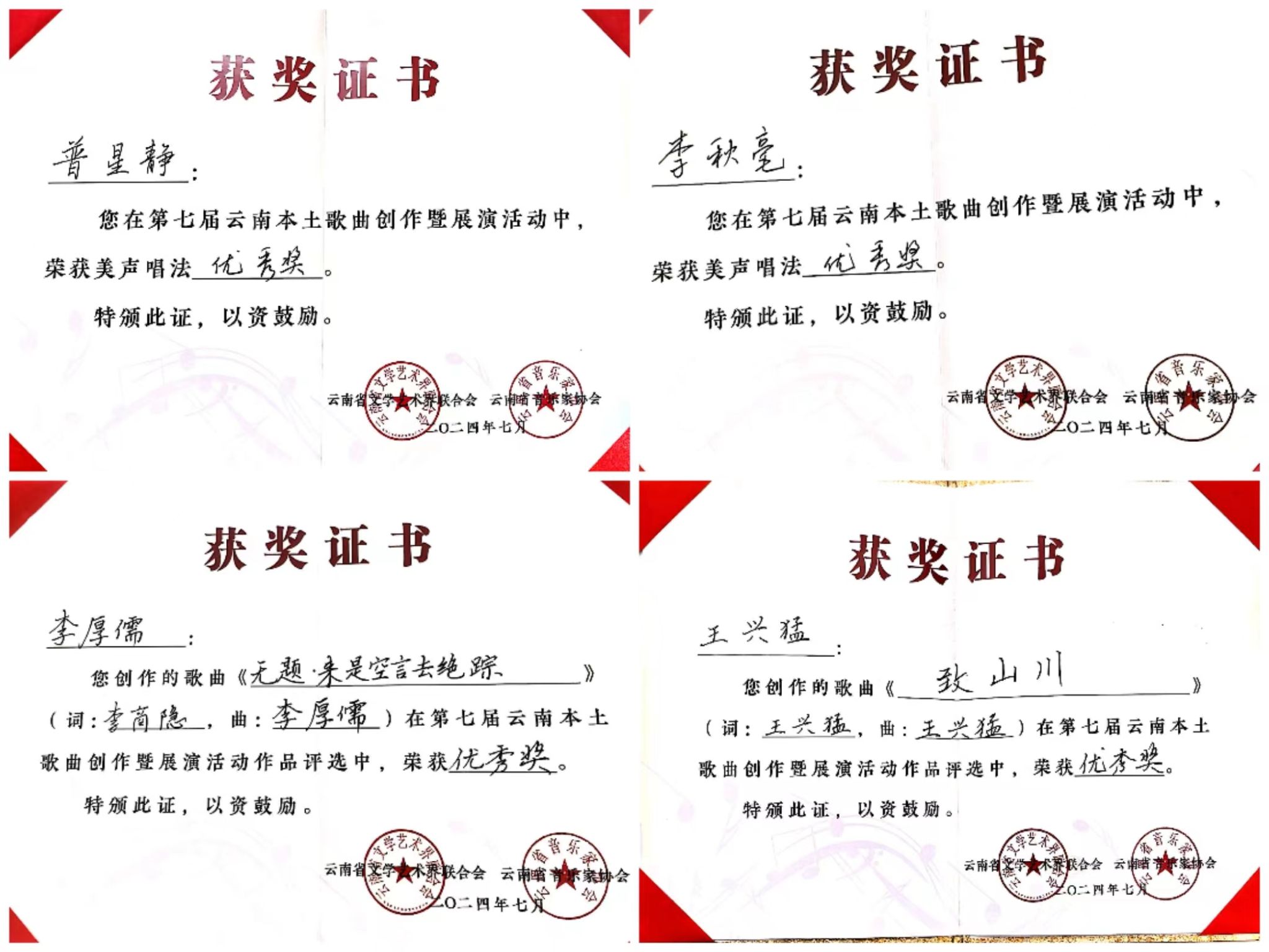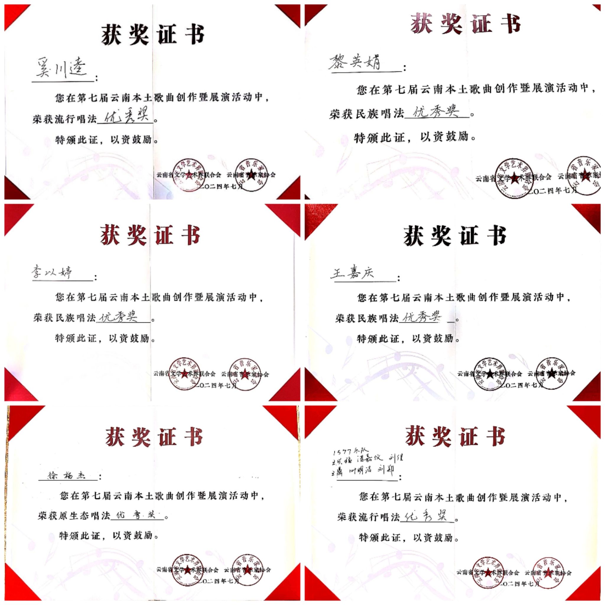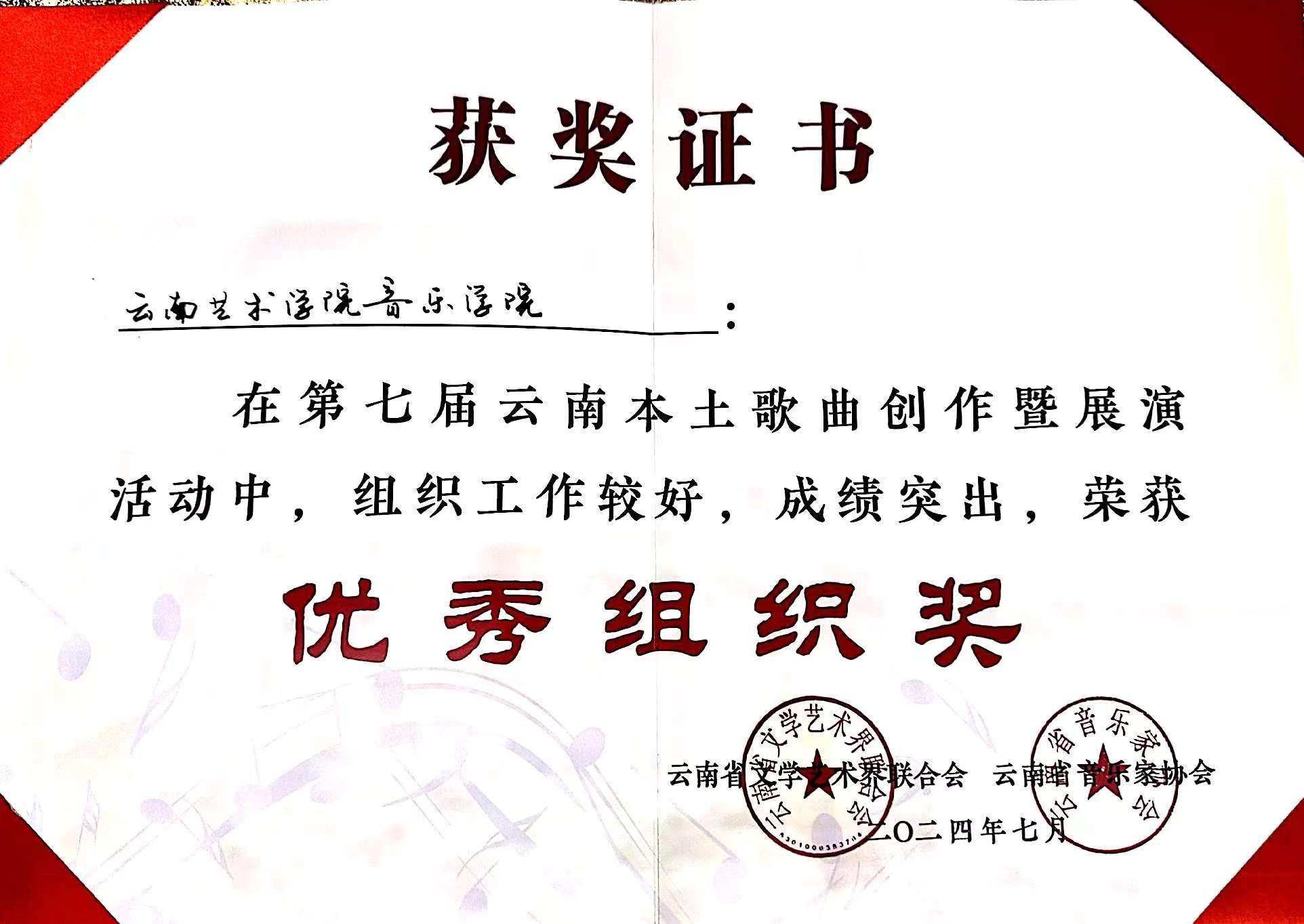 2024年7月23日至27日,由云南省文学艺术界联合会、中共玉溪市委宣传部主办,云南省音乐家协会、玉溪市聂耳文化中心、玉溪市文学艺术界联合会承办的第七届云南本土歌曲创作暨展演活动在玉溪举办。世界杯官方网站入口2026师生在作品类、演唱类(民族、美声、流行、原生态4个组别)两个类别中获3个一等奖、2个二等奖、7个三等奖、10个优秀奖,世界杯官方网站入口2026获优秀组织奖。