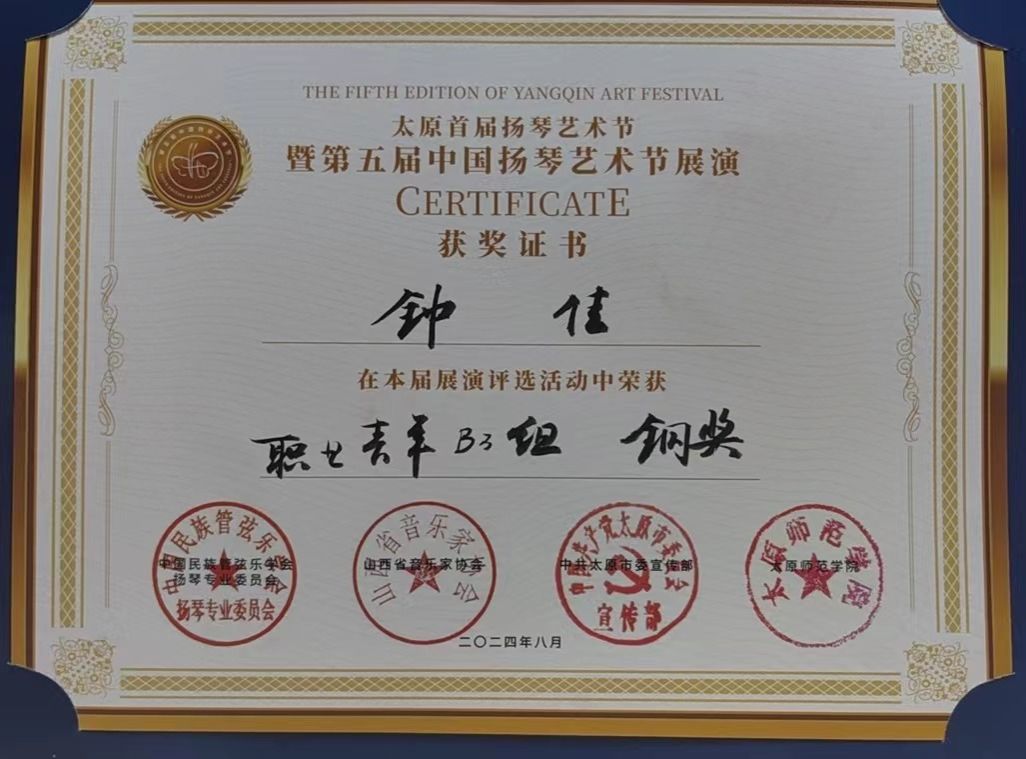 2024年7月29日至8月2日,由中国民族管弦乐协会扬琴专业委员会、山西省音乐家协会、太原市委宣传部主办的太原首届扬琴艺术节暨第五届中国扬琴艺术节展演在太原举行。世界杯官方网站入口2026国乐系系主任王静教授带领扬琴专业员工参与了此次展演。2023级研究生蔡欣彤、2023级本科员工钟佳组成的“云之蝶”组合获职业独奏B组铜奖,钟佳获职业青年B3组铜奖。