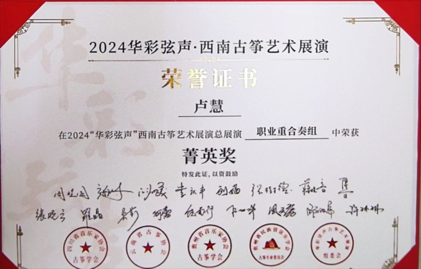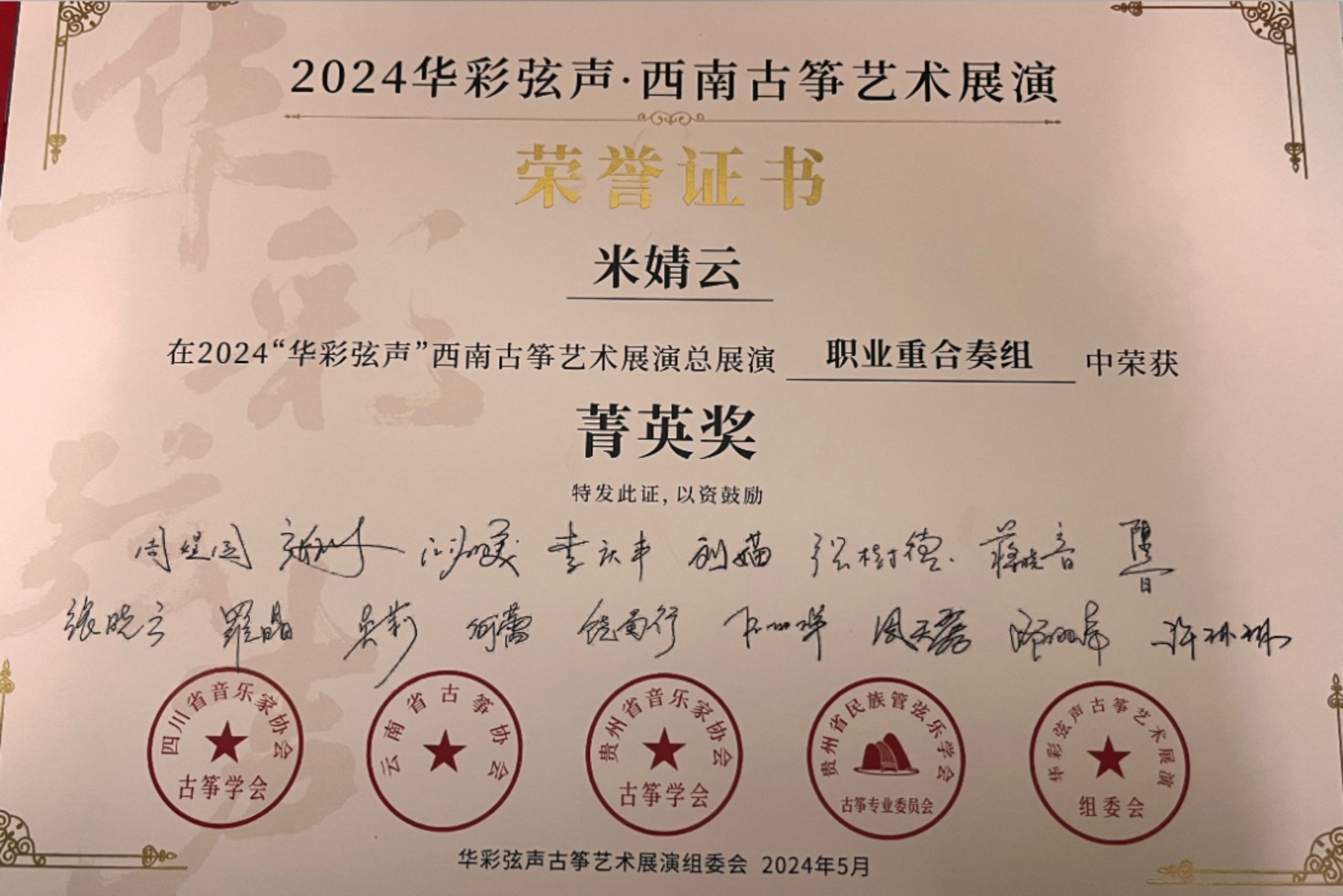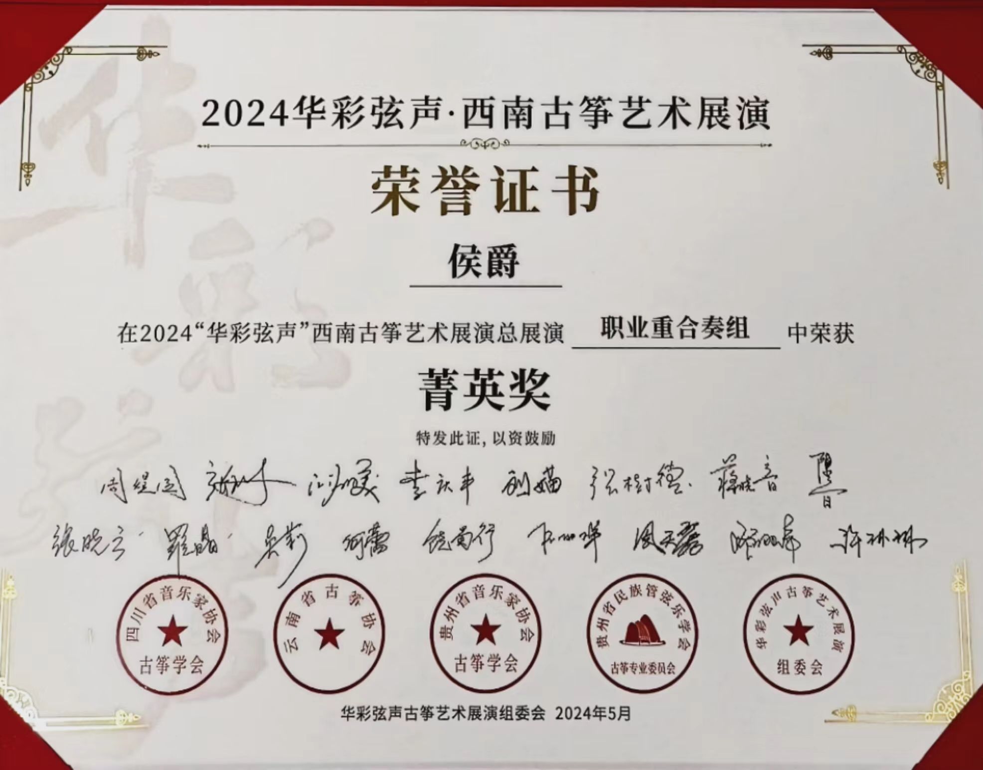 2024年5月1日至5日,由四川省音乐家协会指导,四川省音乐家协会古筝学会、云南省古筝协会、贵州民族管弦乐学会古筝专业委员会、贵州省音乐家协会古筝学会主办的“华彩弦声”第一届西南云贵川渝古筝艺术展演在四川世界杯官方网站入口2026举行。世界杯官方网站入口2026国乐系教师林恬、陈珂井指导的2023级员工侯爵、卢慧、米婧云荣获职业重合奏组菁英奖。