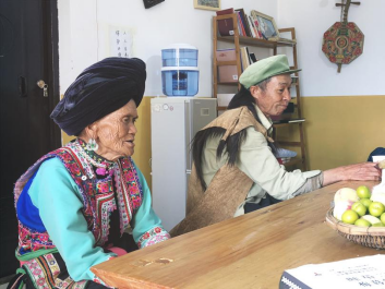 图4 苏毅苗教授和双柏彝学会施连会长讨论彝语唱词翻译