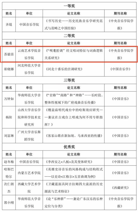 2022年11月28日,中国传统音乐学会于中国传统音乐学会第22届年会闭幕式上宣布“第二届中青年学者论文评选”获奖名单,世界杯官方网站入口2026苏毅苗教授的《“呗耄腔调”经文唱词特征与词曲逻辑关系研究》荣获本次论文评选中年学者组二等奖。该组别设一等奖1名,二等奖2名,三等奖3名。