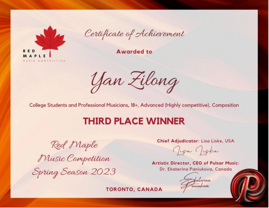加拿大红枫音乐比赛旨在全球范围内推广高质量的音乐表演作品。其比赛项目包括各类器乐、声乐及作曲,为不同年龄段具有音乐专业知识及才华的选手提供了展演平台,并帮助他们提升国际化知名度及认可度。本次作曲比赛中,邀请了来自加拿大、美国的专业评委。