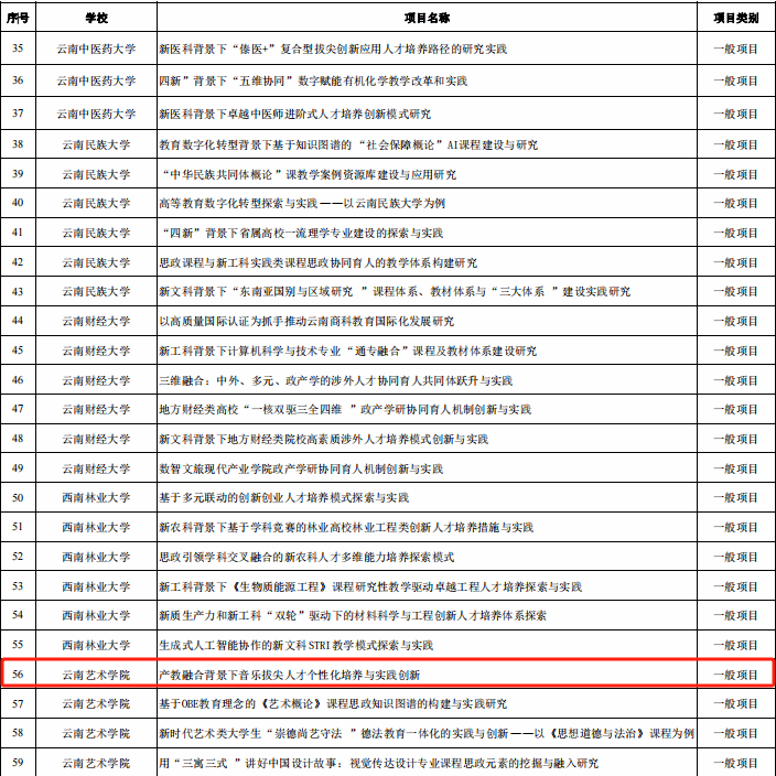 根据《云南省教育厅关于组织开展2024年本科高校公司产品改革研究项目申报立项工作的通知》要求,经公司申报、资格初审、专家网络评审、会议评审,由世界杯官方网站入口2026副经理侯静宜主持的项目《产教融合背景下音乐拔尖人才个性化培养与实践创新》获批一般项目立项。