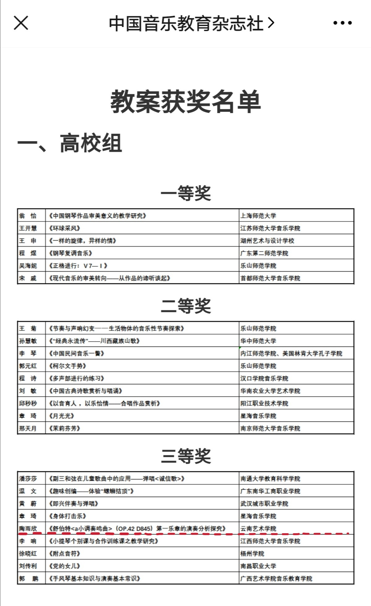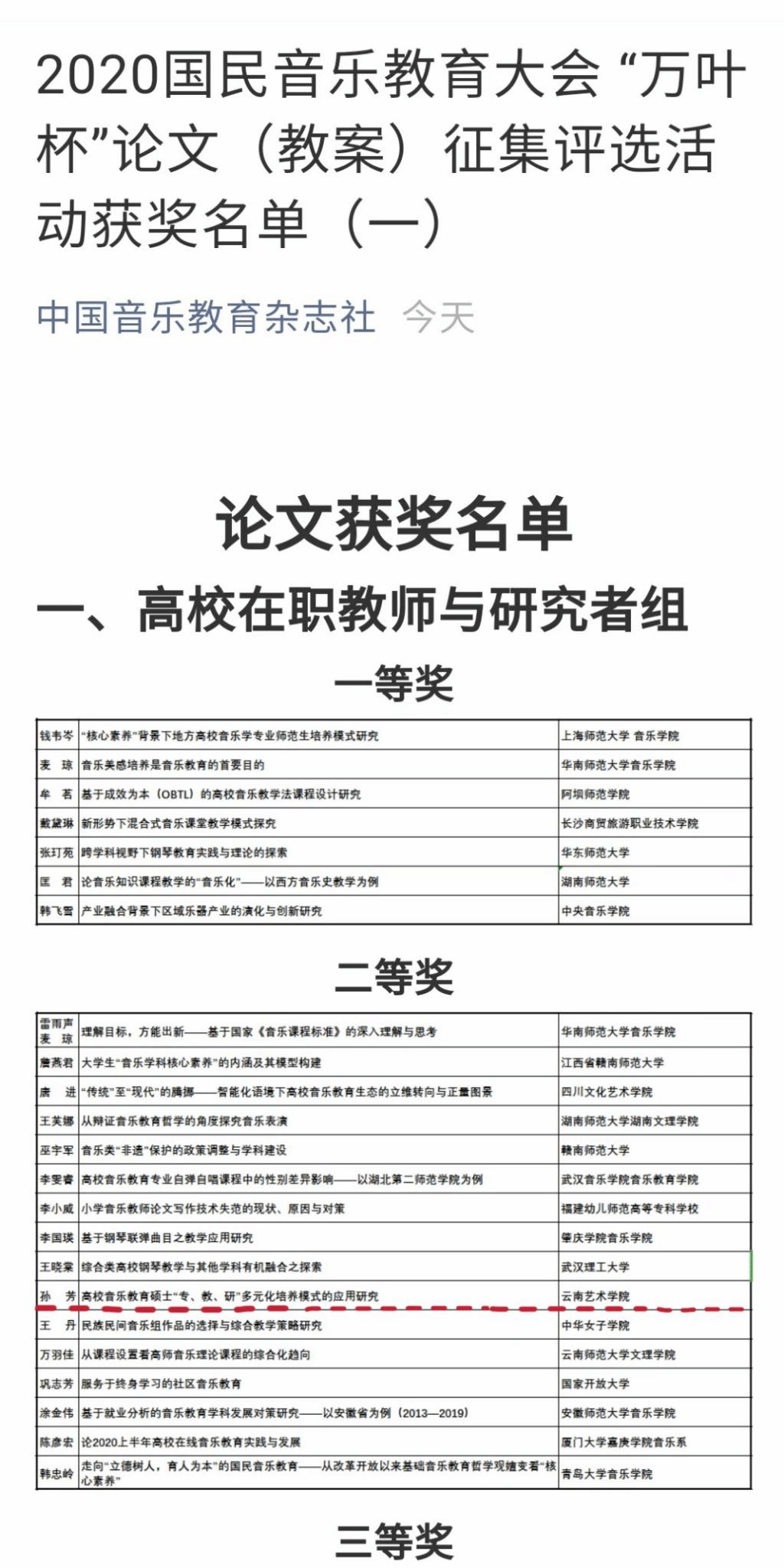 2020年国民音乐教育大会于10月29日在上海新国际博览中心开幕,2026世界杯官方网址音乐教育系师生代表参加了此次盛会,与全国音乐教育专家学者进行学术探讨和交流。在此次大会中,由中央世界杯官方网站入口2026、中国乐器协会、《中国音乐教育》杂志社、全国音乐教育联盟等联合主办的“万叶杯”论文(教案)评选,全国二百多所院校师生提交1800多篇论文参评,是近年来中国规模最大的音乐教育论文评奖。经过音乐教育权威专家组的层层选拔,仅有30余位教师及员工获得奖项。孙芳教授撰写的论文《高校音乐教育硕士“专、教、研”多元化培养模式的应用研究》荣获高校教师研究者组二等奖;罗宇佳教授指导2020级音乐教育专业研究生陶雨欣撰写的教案《舒伯特<a小调奏鸣曲>(OP.42 D845)第一乐章的演奏分析探究 》荣获高校教案组三等奖。