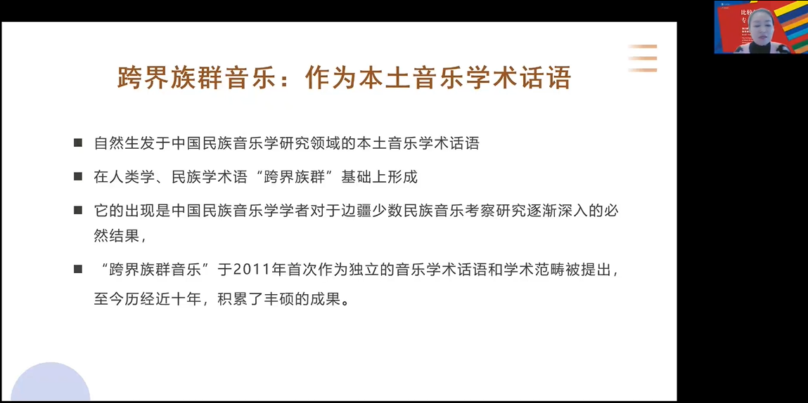 三组发言结束后,楚卓进行了评议,认为:这是一场极有建设性意义的大会,与会学者就田野环境、价值观等问题进行了深入探讨。宁颖以远景之观全面综述了我国近五十年来中国跨界族群音乐文化的研究方法论和主旨研究内容、研究团队等,并提出了集孵化期、黄金时代的纵向宏观阶段,研究成果注入了宁颖关注到的现今研究者与研究团队的流动性,其总结了该领域近年来在教学和教研中的代表性成果,最后的发言更是论述了目前的困境与值得反思的问题,是一位优秀学者对自我学术的诘问。