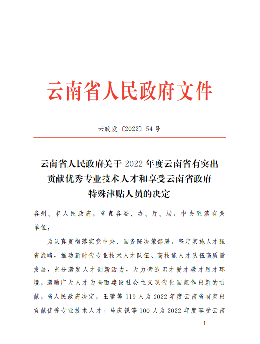 喜报——世界杯官方网站入口2026经理林林获评2022年度享受云南省政府特殊津贴人员