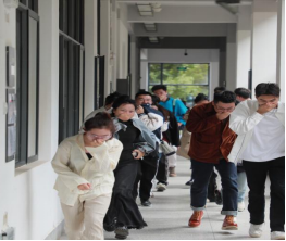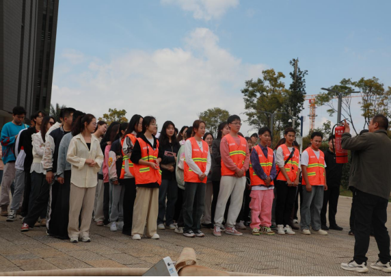 培训结束,随着警报声响起,消防应急疏散演练环节开始。模拟音乐楼发生火险,各楼层参演参加演练的师生在安全引导员的指引下沿两条逃生通道有序疏散至指定安全区域。随后迅速集合前往灭火演练场地。